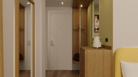 Eleven-story hotel & twenty-two-story residency complement each other and are conceived as one architectural piece. The edifice immediately pops out with its playful color-gradation. The 170 hotel rooms are tastefully designed to create the utmost comfort, keeping with the Hampton by Hilton